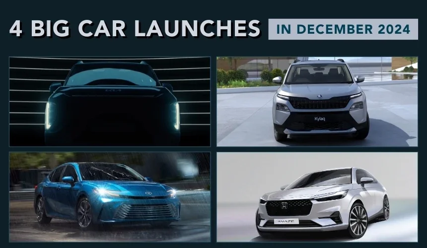 Skoda Kylaq: Price announcement on 2nd December; deliveries start January 2025. Honda Amaze: New-gen launch with ADAS on 4th December. Toyota Camry: Ninth-gen model coming on 11th December. Kia Syros: Global debut on 19th December with ADAS features.