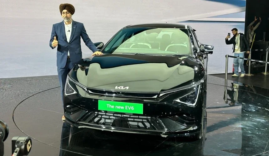 Kia has revealed EV6 at Auto Expo 2025 EV6 is expected to launch in March It comes with all-new 84kWh battery unit